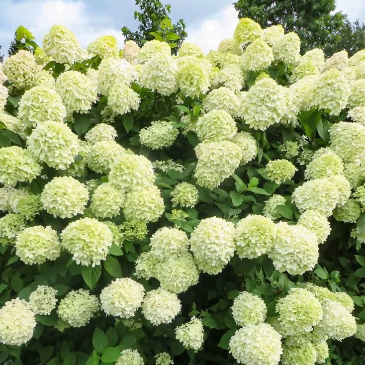 соцветия большие 30-35 см, плотные, при распускании цветов зеленоватые, потом их окраска меняется на лаймово-белую, а ближе к осени возможно добавление розоватых оттенков;
