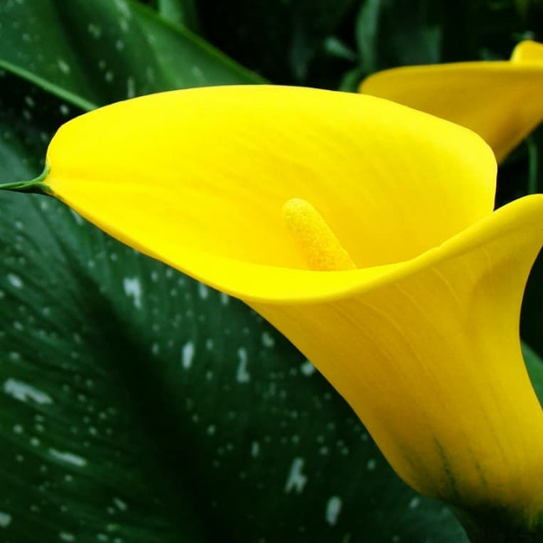 Калла Саншайн — формирует восковидный желтый бокал диаметром 7−8 см. Высота «покрывала» достигает 15 см. Рост в период цветения может составлять до 60 см.Растение формирует сразу несколько цветоносов. Охваченные крупными прикорневыми листьями стебли образуют подобие флористической композиции. Сорт отлично смотрится в срезке. Цветение май-август (в зависимости от срока высадки клубней). Количество цветков зависит от размера клубня, может быть от 3 до 10. ПОСАДКА М УХОД. Рано весной в горшки для комнатной культуры, в открытый грунт — после того, как минует угроза заморозков. Клубни  сажают на глубину 5-10 см и хорошо проливают почву, поскольку каллы любят влагу. Для посадки каллы подойдет притененный участок. Идеальный вариант, место под негустыми кронами деревьев. Чтобы было достаточно светло, а солнечные лучи не обжигали листьев. Очень эффектно смотрятся каллы, рядом с искусственным водоемом. Отлично цветет и растет только в тепле, где температура не ниже 18°C, самая оптимальная температура 22-23°C. Не переносит сквозняков. Цветоносы этого растения высокие, которые идут прямо от низа растения. На открытом воздухе это прекрасное растение цветет 1 месяц, а в закрытом помещении — 14 дней. Осенью растения сбрасывают листья. На зиму клубни каллы нужно выкопать и хранить в непромерзаемом помещении.
